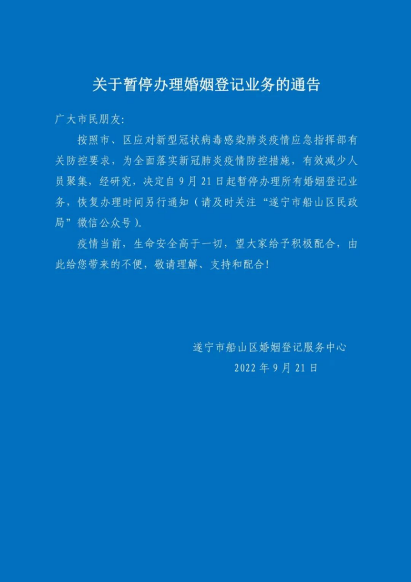遂宁市船山区婚姻登记服务中心关于暂停办理婚姻登记业务的通告