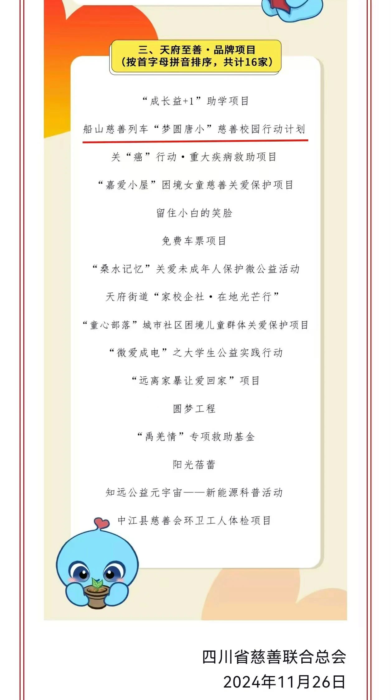 11月26日,四川省慈善联合总会发布2023年度“天府至善伙伴”名单,遂宁市船山区慈善列车“梦圆唐小”慈善校园行动计划入选天府至善·品牌项目。