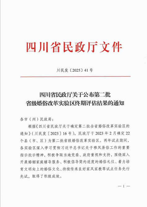 近日,四川省民政厅公布了第二批省级婚俗改革实验区终期评估结果,遂宁市船山区顺利通过终期验收,试点合格。