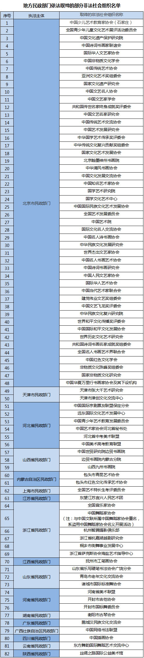 近年来,民政部和各地民政部门持续开展打击整治非法社会组织工作,中国文联也积极发布维权预警,对文艺类的非法社会组织进行曝光。2021年1至8月,民政部已公布五批涉嫌非法社会组织名单、七批地方民政部门依法取缔的部分非法社会组织名单。为防止不明真相的文艺组织和文艺工作者上当受骗,我们将其中与文艺相关的96个非法社会组织进行了汇总整理,共涉及北京、河北、浙江等17个省市自治区。