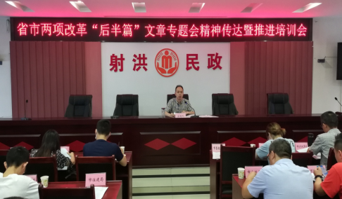 8月27日,射洪市召开省市两项改革“后半篇”文章专题会精神传达暨推进培训会,市惠民帮扶中心副主任、市镇村两项改革“后半篇”文章专项工作领导小组办公室副主任丁裕明主持会议。市直相关部门及两项改革试点镇负责人参加会议。