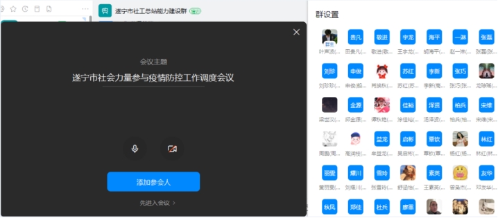9月22日晚上,市民政局组织召开社会力量参与疫情防控工作调度会,市、县(市、区)民政局分管同志、科股室负责同志及社会工作总站负责同志、专岗社工50余人通过“钉钉”视频连线,共同分析社会组织、社会工作者、志愿者、社会慈善资源参与疫情防控存在的问题,并就进一步加强统筹调度、完善管理台账、规范捐赠管理、加强防护保障和信息宣传等工作进行安排。截至9月22日19点,依托市、县(市、区)社会工作支持中心、社会工作总站,累计开展乡镇(街道)社工站、村(社区)社工室志愿者招募、社区排查、小区核酸检测辅助、老弱病残孕等急难对象需求对接等调度活动46次。