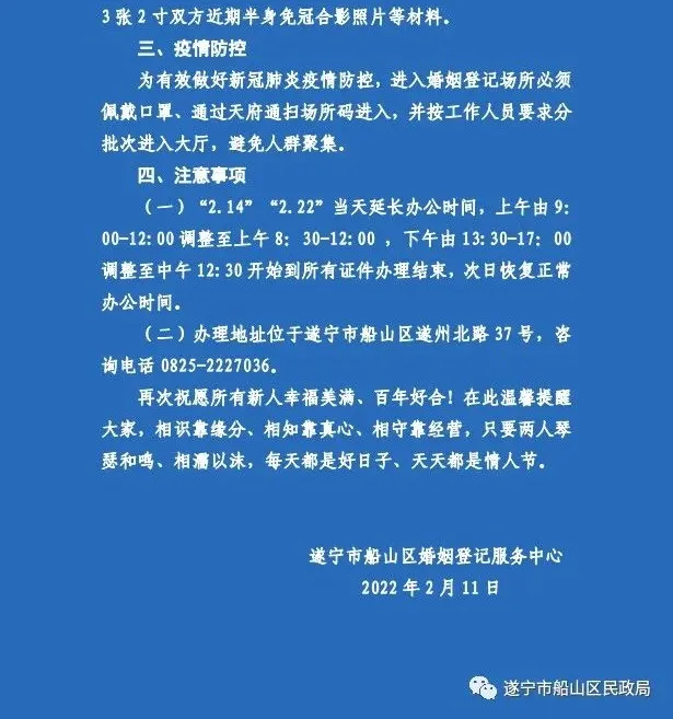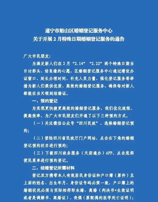 遂宁市船山区婚姻登记服务中心关于开展 2 月特殊日期婚姻登记服务的通告