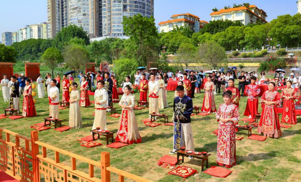 船山区,举办“才聚船山·潼心莲里”集体婚礼,船潼双城联袂演绎中式婚典,文脉为舟载动“甜蜜经济”。来自遂潼两地的16对青年才俊身着凤冠霞帔,以“却扇初见”“合卺交杯”等千年古礼,在观音故里续写新时代的《浮生六记》。