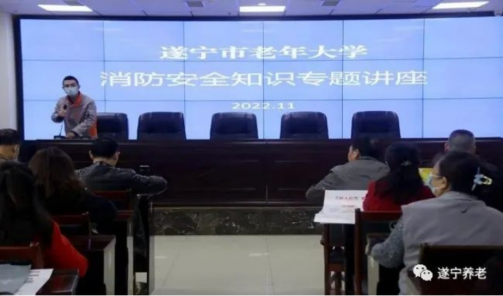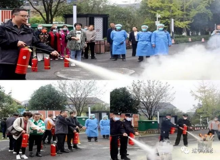 11月9日上午,为贯彻落实习近平总书记“人民至上、生命至上”的安全理念,提高老年学员和干部职工在火灾逃生、自救与互救及突发事件的应变能力,遂宁市老年大学组织教职员工和老年学员开展消防安全知识培训、应急疏散、灭火演练。
