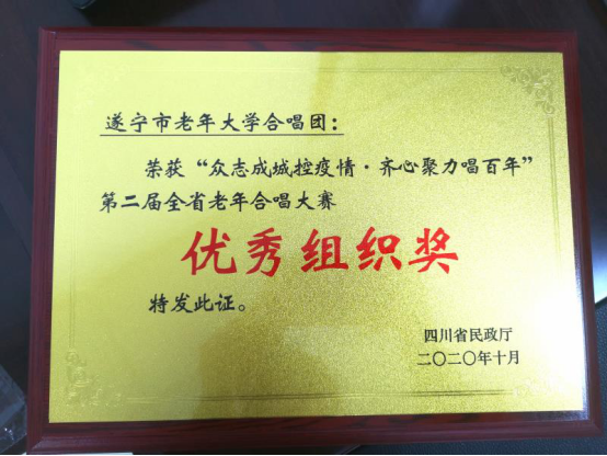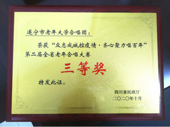 10月24日,由四川省民政厅举办的第二届全省老年合唱大赛决赛在四川省电视台S1演播厅落下帷幕。市老年大学合唱团代表遂宁市以一首激情澎湃的《旗帜颂》从全省19个参赛的合唱团中脱颖而出,经过一个多月的辛苦排练,通过初赛、复赛、决赛三个阶段的评选,最终获得三等奖和优秀组织奖两个奖项的荣誉。