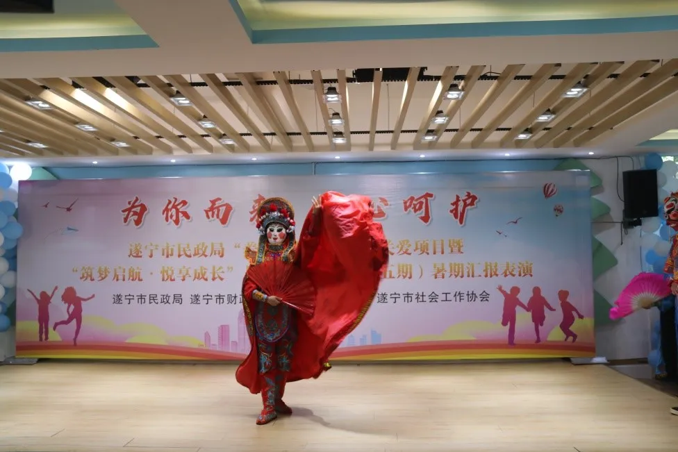 8月21日,遂宁市民政局 “养治康教社”儿童关爱项目暨“筑梦启航·悦享成长”儿童关爱服务项目暑期汇报表演在市儿童福利院顺利开展,市民政局、市财政局相关负责同志出席此次活动。