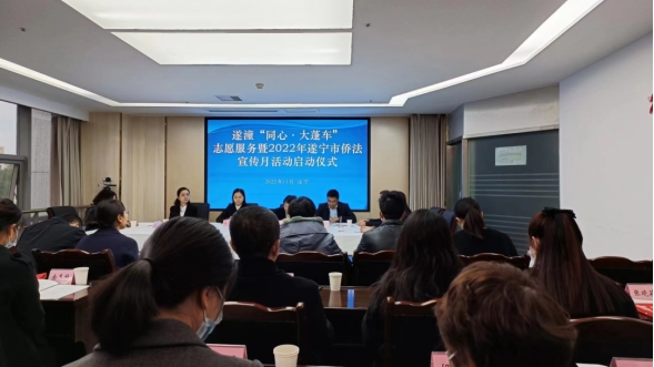 为学习贯彻党的二十大精神,务实践行“4321”工作法,引导侨界全力以赴拼经济、搞建设,助力成渝地区双城经济圈建设,11月29日,遂潼“同心·大蓬车”志愿服务暨2022年遂宁市侨法宣传月活动启动仪式举行。市人大常委会副主任刘枫出席活动并宣布遂潼“同心·大篷车”志愿服务暨遂宁市2022年侨法宣传月活动正式启动。