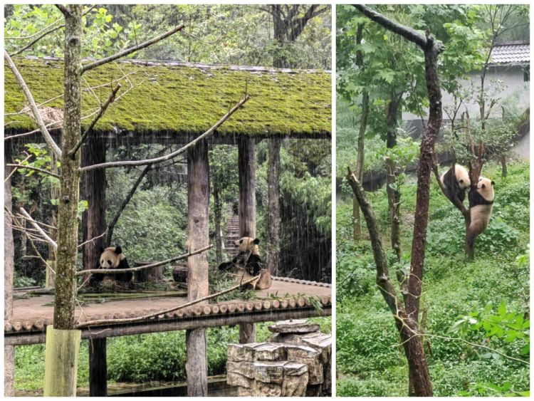 基地内功能园区,孩子们看到憨态可掬的大熊猫也是格外兴奋。它们或在木架休憩,或在树上打闹嬉戏,或坐在木架上大口吃着竹笋、竹竿,各种搞怪卖萌、憨态可掬的模样逗得大家笑声连连,纷纷驻足留影。