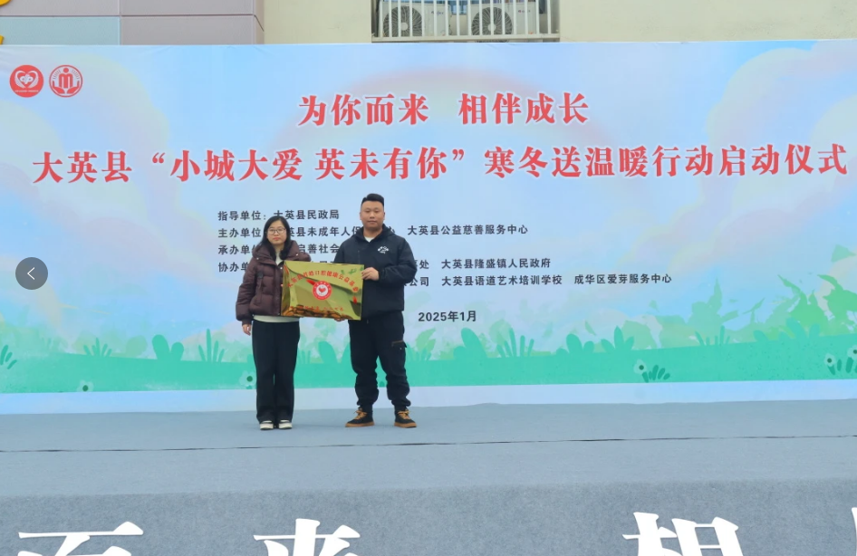 1月15日,在省级“为你而来·相伴成长”儿童关爱保护项目支持下,由大英县未成年人保护中心、大英县公益慈善服务中心主办,大英启善社会工作服务中心承办的大英县“小城大爱 英未有你”寒冬送温暖行动启动仪式在县未成年人保护中心举行。盐井街道、隆盛镇、红旗学校、村社、儿童工作者、儿童及家长代表等130余人参会。