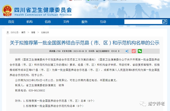 日前,四川省卫生健康委员会公示了拟推荐第一批全国医养结合示范县(市、区)和示范机构名单,公示期为2023年5月6日-5月11日,现已结束。