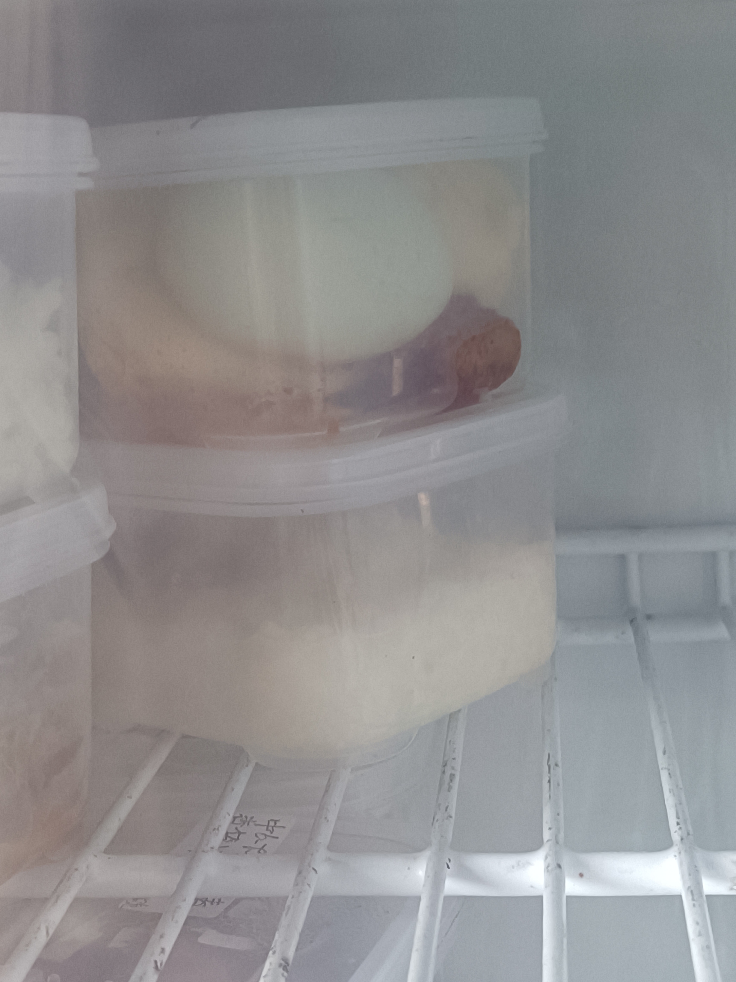 存在问题:食品留样不规范,食材混装在一个留样盒内。
