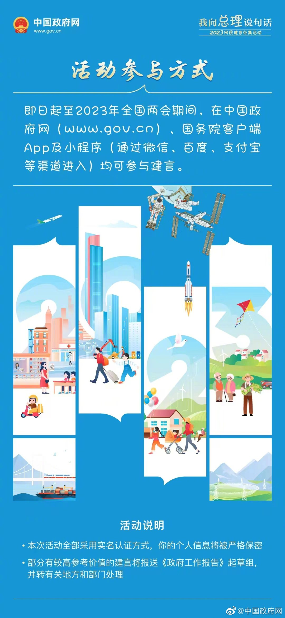 【2023“我向总理说句话”网民建言征集活动开始】我向总理说句话,留言直达国务院。即日起至2023年全国两会,中国政府网(www.gov.cn)联合多家网络媒体平台,以及各省区市、相关部委政府网站,开展第九次“我向总理说句话”网民建言征集活动。