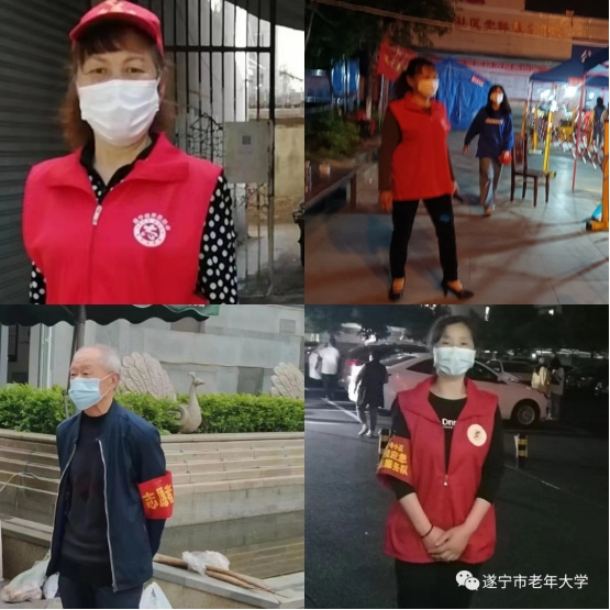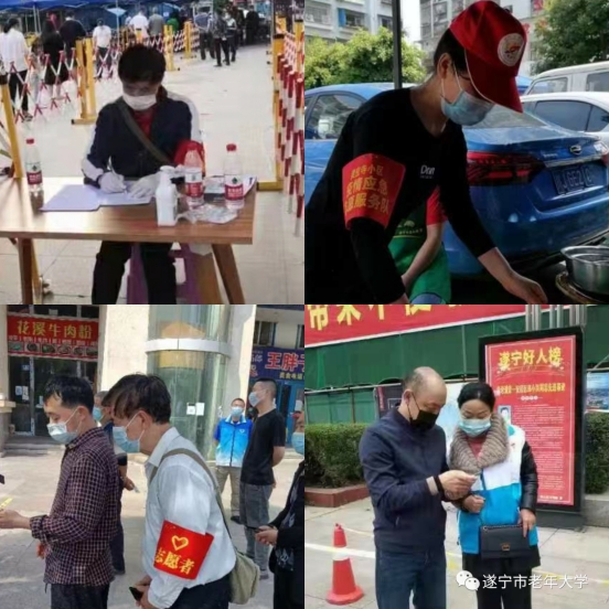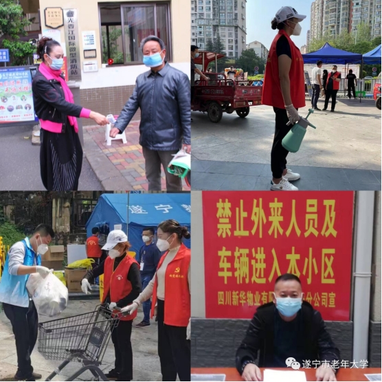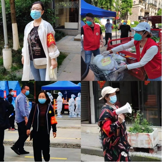 疫情面前,遂宁市老年大学干部职工积极响应遂宁市疫情防控指挥部号召,主动参与联防联控。我校教职员工、老年学员积极主动,毫不犹豫地加入到各社区志愿者服务队伍中,据初步统计,我校有100余名志愿者参加疫情防控服务。