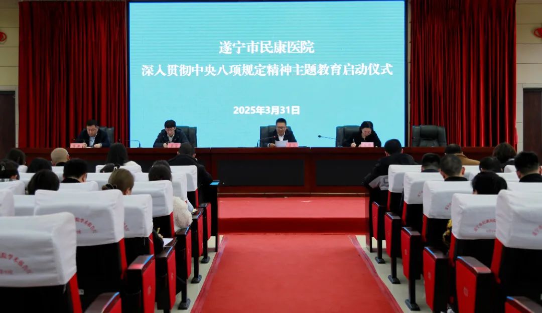 3月31日下午,遂宁市第六人民医院召开深入贯彻中央八项规定精神学习教育启动仪式,深入学习领悟习近平总书记关于加强党的作风建设的重要论述,传达党中央决策部署和省委、市委、市民政局党组有关会议和文件精神,部署医院深入贯彻中央八项规定精神学习教育工作。院领导班子,中层干部、医师(含医技部门)护士长、业务骨干等参加了会议。