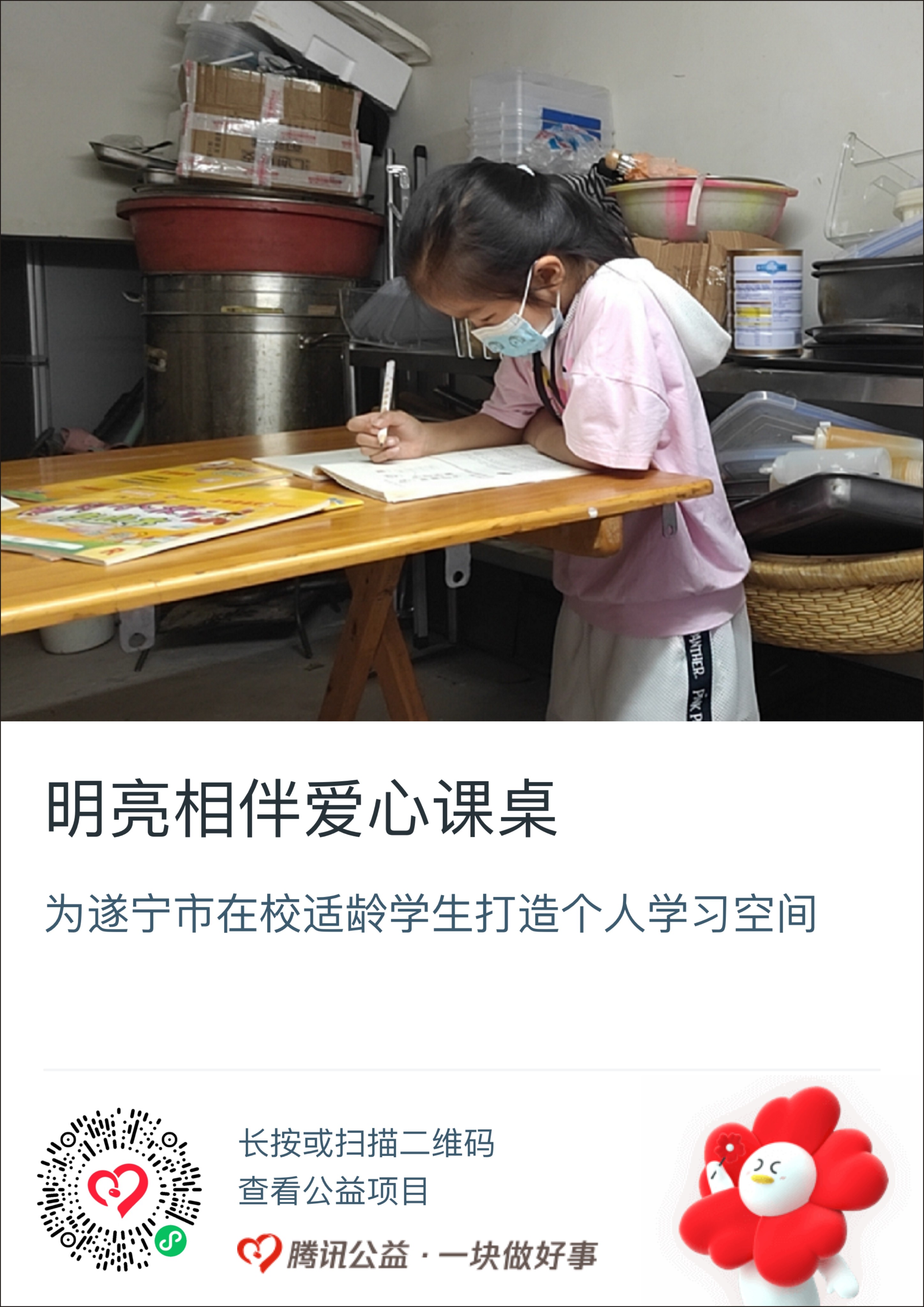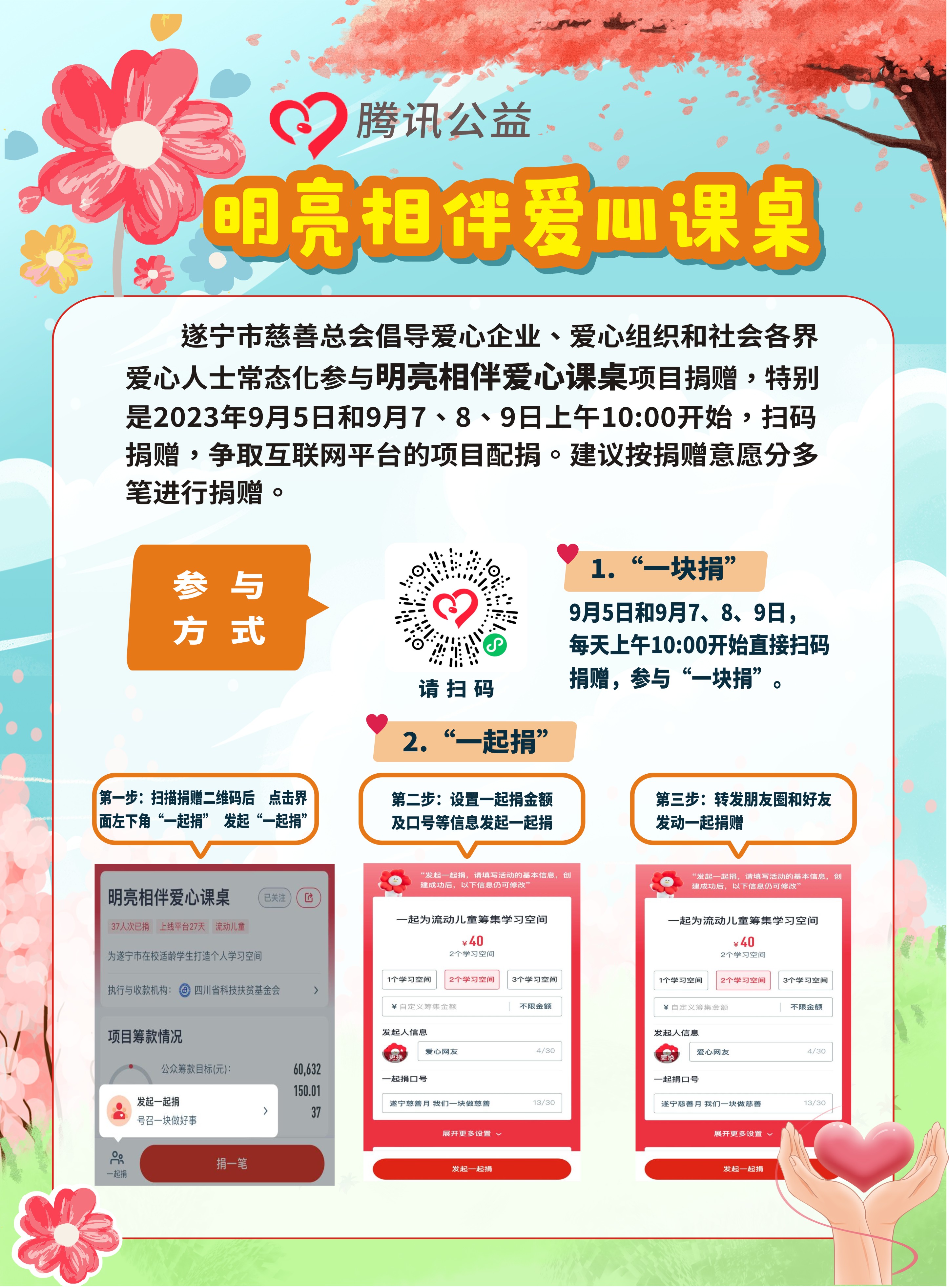 遂宁市慈善总会联合四川省科技扶贫基金会在腾讯公益平台上线了“关爱健康护苗成长”、“明亮相伴爱心课桌”等项目,现面向社会发布募捐倡议书并设置捐赠二维码,倡议社会各行业和各界爱心人士奉献爱心,常态化参与项目捐赠,特别是2023年9月5日和7、8、9日上午10:00开始,扫码捐赠,争取互联网平台的项目配捐。