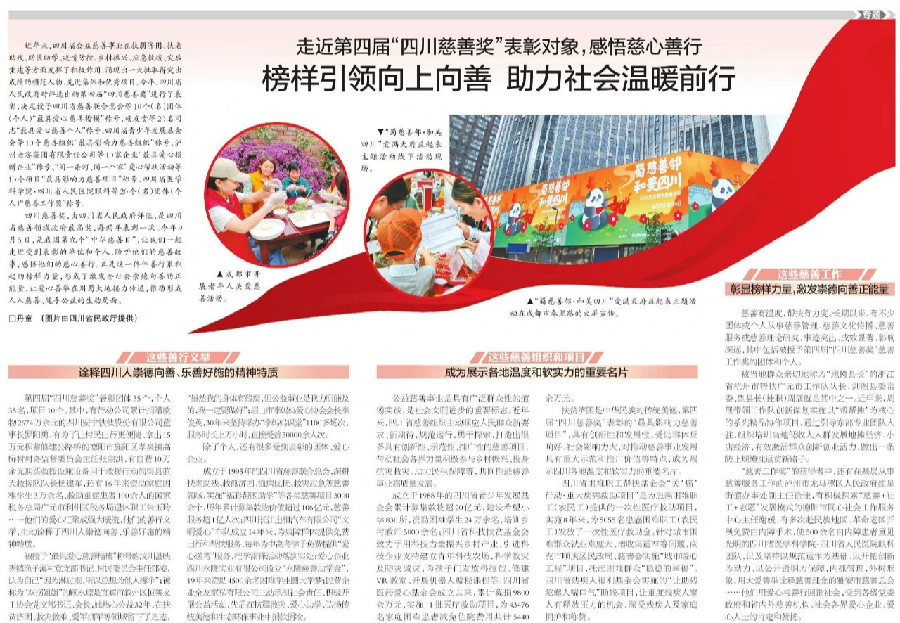 四川慈善奖,由四川省人民政府评选,是四川省慈善领域政府最高奖,每两年表彰一次。今年9月5日,是我国第九个“中华慈善日”,让我们一起走近受到表彰的单位和个人,聆听他们的慈善故事,感悟他们的慈心善行。正是这一件件善行累积起的榜样力量,形成了激发全社会崇德向善的正能量,让爱心善举在川蜀大地接力传递,推动形成人人慈善、随手公益的生动局面。