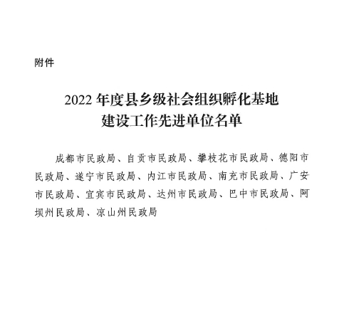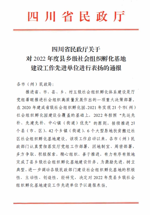 1月6日,四川省民政厅发布关于对2022年度县乡级社会组织孵化建设工作先进单位进行表扬的通报。遂宁市民政局获评2022年度县乡级社会组织孵化基地建设工作先进单位。