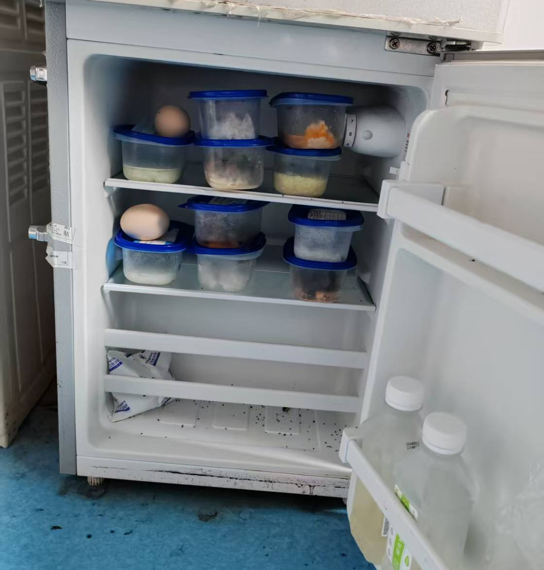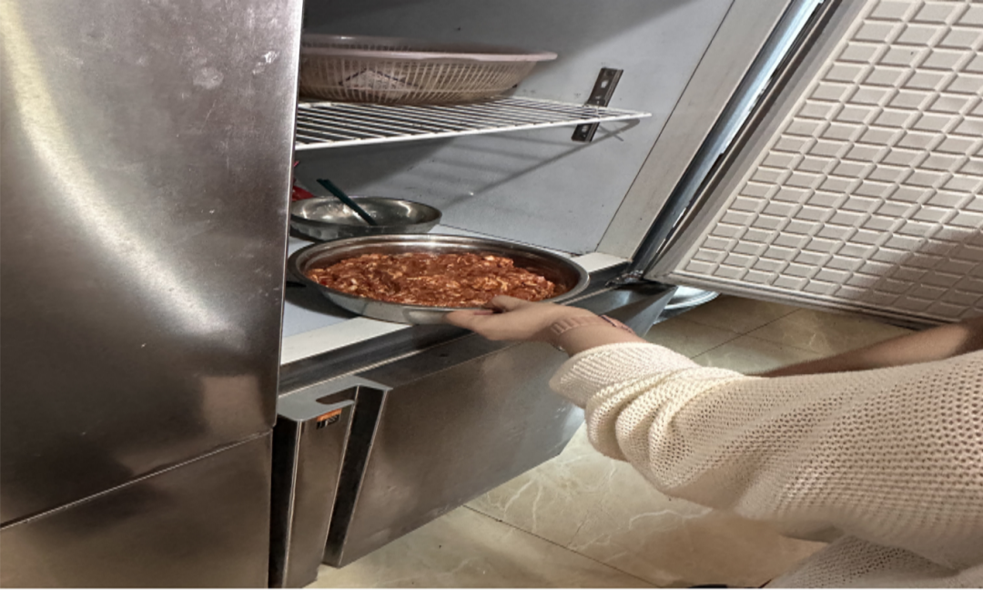 存在问题:食堂冰柜温度不够,肉品未分隔保存。