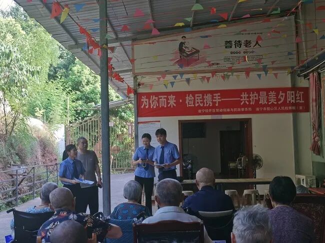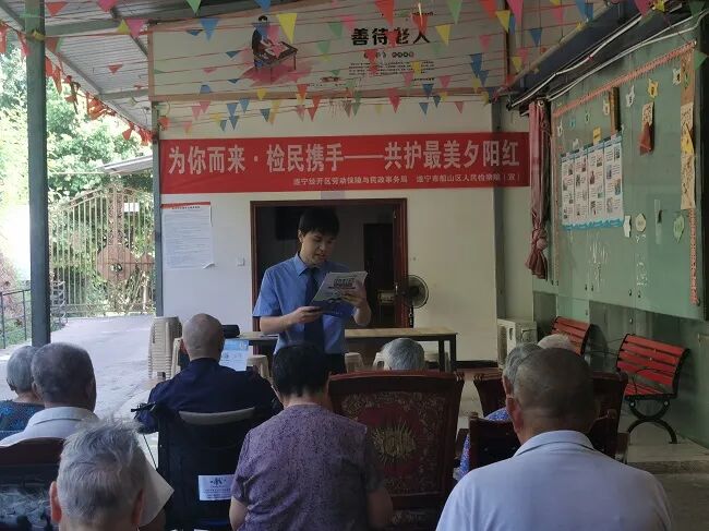 近日,为提高老年人法律意识和自我防范能力,推动老年人权益保护工作更进一步。经开区劳动保障与民政事务局联合船山区人民检察院在遂宁经济技术开发区善德养老院成功举办了红盾护老法律知识宣讲活动。本次活动旨在通过宣讲相关法律法规、讲解实际案例,让老年人了解并掌握与其生活息息相关的法律知识,从而预防各类诈骗和侵权行为的发生。