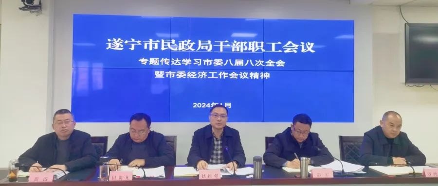 会议传达学习了中国共产党遂宁市第八届委员会第八次全体会议暨市委经济工作会议精神。会议指出,李江书记在市委八届八次全会上的重要讲话,紧紧围绕学习贯彻习近平总书记重要指示精神这一主线,精准聚焦以县域为重要切入点扎实推进城乡融合发展这一主题,绘制出了遂宁城乡融合发展的一张宏伟蓝图。会英市长的讲话,全面总结了经济社会发展亮眼成绩,给出了清晰的任务书、施工图、时间表,鼓舞人心、倍感振奋。全市民政系统要始终保持“拼”的勇气、“比”的劲头、“竞”的状态,学在前、谋在前、干在前,在全市民政系统迅速掀起学习贯彻热潮。