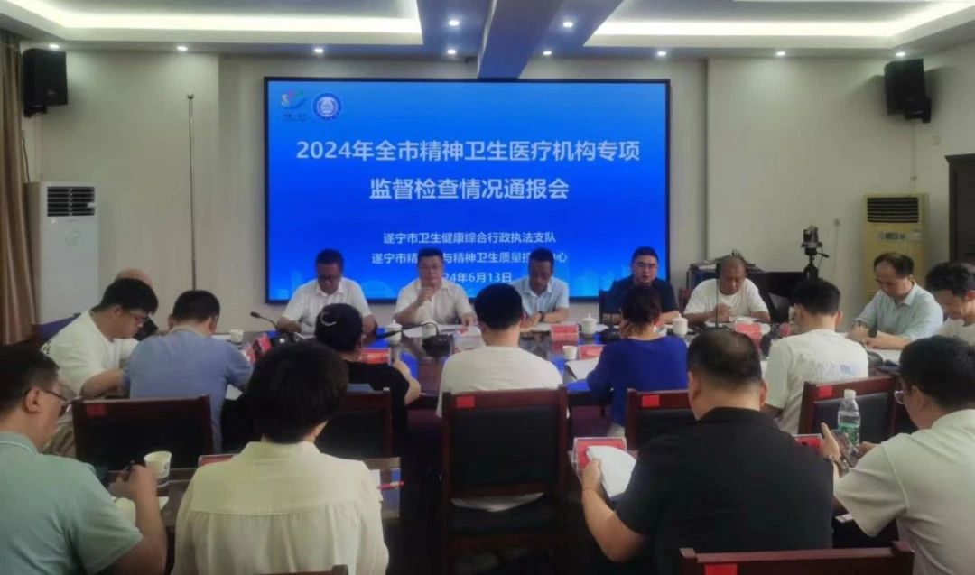 为进一步加强精神卫生医疗机构的监督管理,切实保障精神障碍患者的合法权益,维护健康安全的医疗秩序,6月13日下午,遂宁市卫生健康综合行政执法支队、遂宁市精神卫生质量控制中心联合召开全市精神卫生专项监督检查情况通报会,总结前期专项检查情况,分析存在的问题,并提出相应的整改措施和后续监管计划。