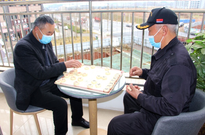 走进活动中心,映入眼帘的是整齐摆放着各类文学书刊和退役军人就业创业、退役士兵安置政策问题、军人抚恤优待条例等宣传手册的书架,长桌上七八名退役老兵正在畅聊曾经的军旅生活,阳台上两名退役老兵正在下着象棋……