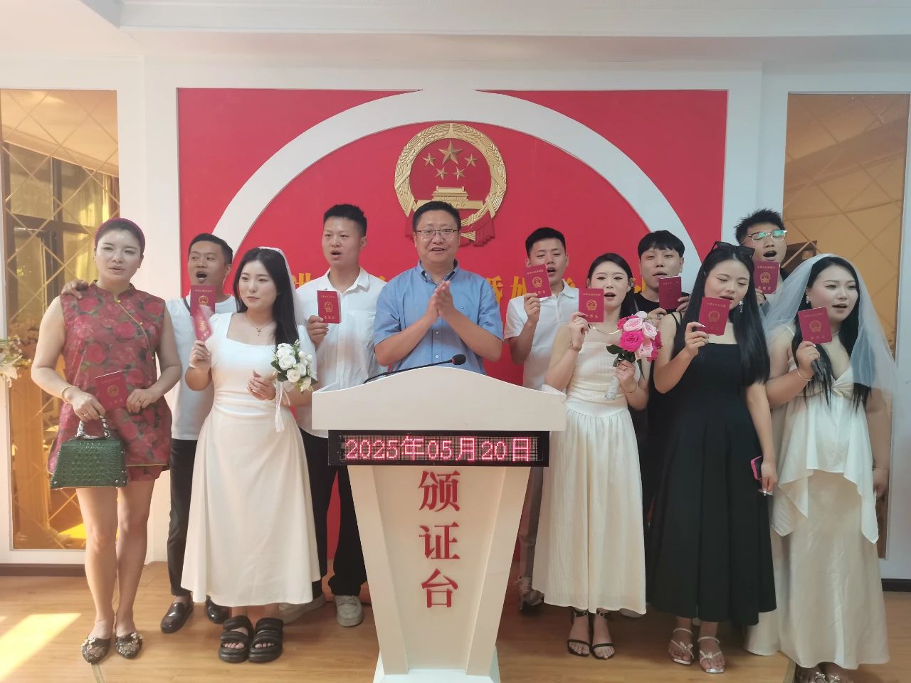 2025年5月20日,射洪市民政局婚姻登记处迎来结婚登记高峰,96对新人顺利领证。为应对高峰,市民政局提前制定应急预案,实行“现场+网上预约”双通道分流办理,增设办证窗口并安排专人指导填表、初审材料,平均办理时长显著缩减。服务时间延长,办证时间调整为8:30-12:00;1:30-5:30,确保“即来即办”。