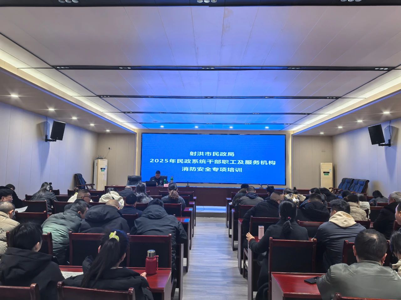 2025年3月4日,射洪市民政局紧密围绕安全生产“五预”工作机制,以“筑牢安全防线,守护民生底线”为主题,组织开展2025年民政系统干部职工及服务机构消防安全专项培训,21家民政服务机构、90余名人员参加培训。