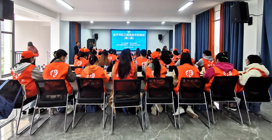 10月11日,遂宁市第二期社工岗项目示范培训在射洪市社会组织孵化基地举行。培训由遂宁市民政局、射洪市民政局主办,遂宁社会组织服务中心(遂宁市社会工作支持中心)、射洪市社会工作协会(射洪市社会工作总站)联合承办。射洪市社会工作总站、各乡镇(街道)社工站42名专岗社工参加培训。射洪市民政局副局长雷森作开班动员。