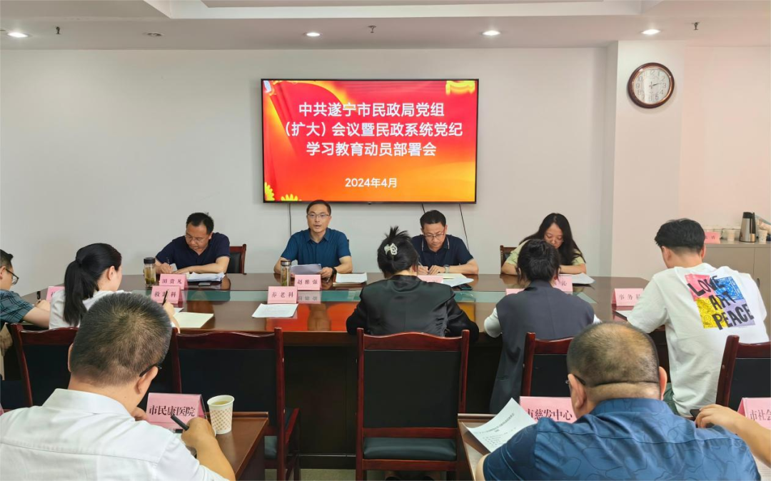 4月15日,遂宁市民政局召开党组(扩大)会议暨党纪学习教育动员部署会,传达学习习近平总书记关于党纪学习教育的重要讲话和重要指示精神,研究部署全局党纪学习教育工作。市民政局党组书记、局长赵维强主持会议并讲话。