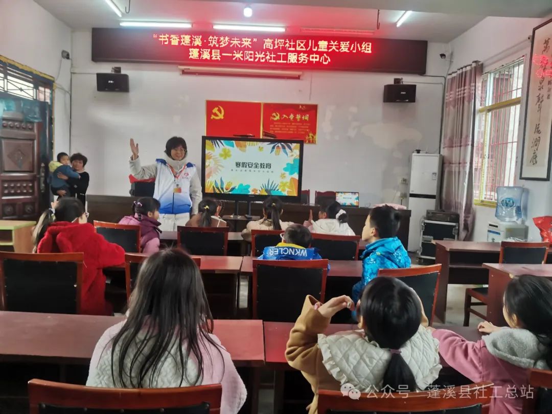 为保障社区儿童的寒假安全,落实做好2023年城乡社区综合服务“提能力”工程项目,2024年2月5日上午蓬溪县一米阳光社工服务中心在高坪社区组织了一场主题为“书香蓬溪·筑梦未来”高坪社区儿童关爱小组——寒假安全注意事项活动。该活动旨在提高儿童及其家庭对寒假期间潜在安全风险的警觉性,并教授应对策略。