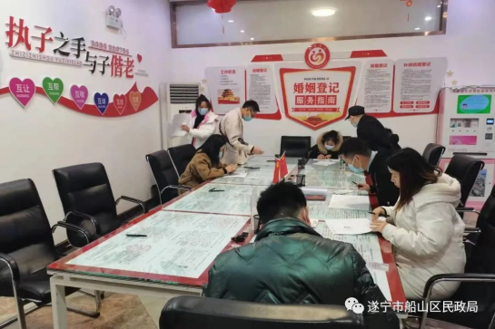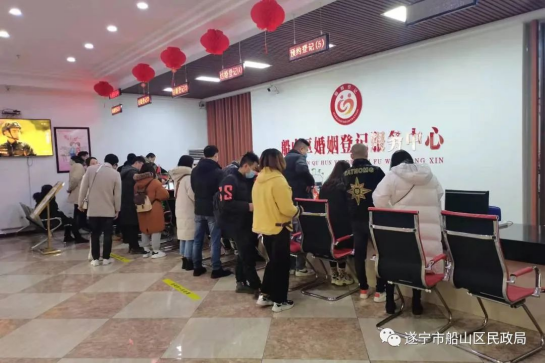 为积极应对可能出现的登记高峰,让准新人们不受疫情影响顺利领到“红本本”,船山区婚姻登记服务中心提前谋划,制定了详细方案以及应急预案,特推出“结婚登记三套组合拳”——“预约办、延时办、预审办”,增设当日预约号、延长办理时间、提前预审办理。并提前做好相关工作的安排部署,确保“2.22”婚姻登记有序、高效地进行。