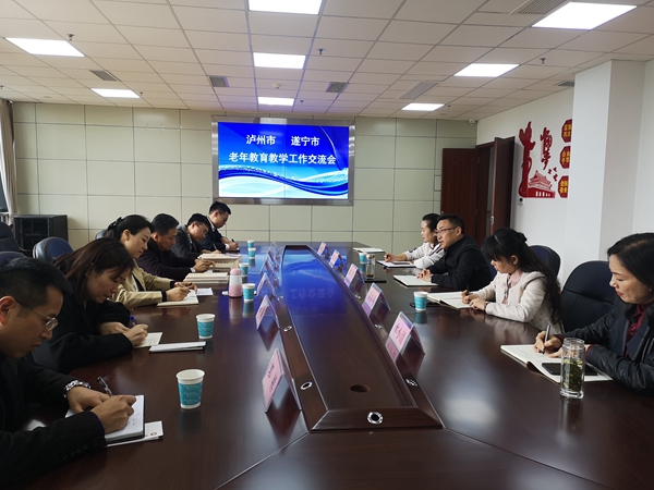 近日,泸州市老年大学一行在常务副校长唐小玉的带领下,到遂宁市考察交流老年教育教学工作。遂宁市民政局党组成员、校长彭军,副校长袁红梅、邓艳等陪同参观并座谈交流。