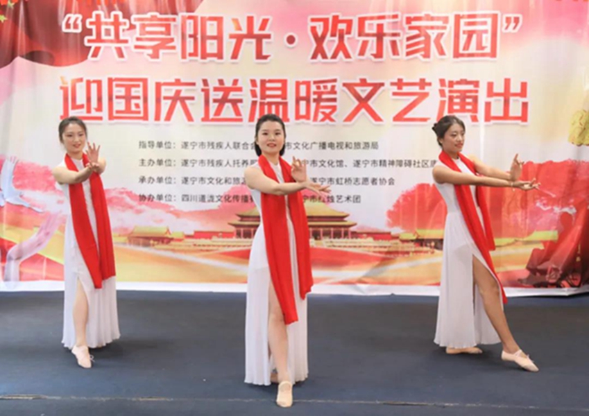 金秋时节,秋高气爽。9月28日,“共享阳光 欢乐家园”迎国庆送温暖文艺演出活动在遂宁市精神障碍社区康复中心拉开帷幕,活动现场歌声嘹亮,热闹非凡,大家一起挥舞红旗、高唱红歌,表达对祖国母亲的美好祝愿。