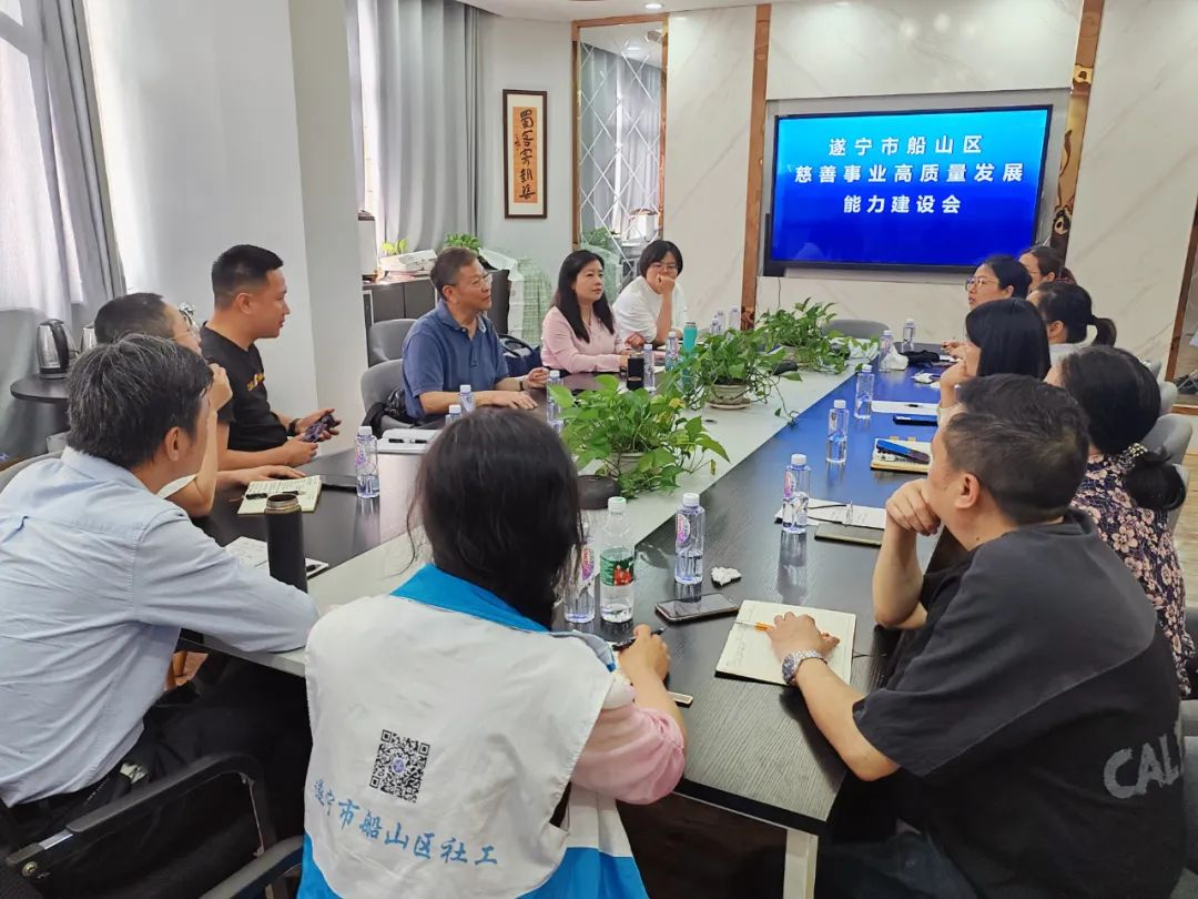 现场调研后,在社工总站举行了慈善事业高质量发展能力建设会。荣道清分享搭建社区慈善资源共享平台课件,系统介绍了发展社区慈善的背景意义、平台建设、使命功能、核心问题、长效机制,以及国内先进地区在互联网慈善、社区慈善方面的经验做法。他表示,后续将联络资源前来开展“书记面对面”交流,帮助船山的社区进一步拓展思路、提升能力,促进社区更美更善更强、城乡居民更幸福。
