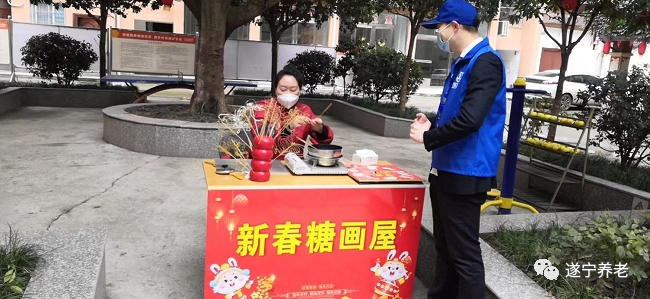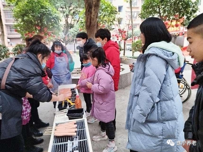 最后是大家最期待的“游园”活动。“游园”活动按照“年味小庙会”的方式,设置有非遗文化特产糖画小屋、可口的爆米花小摊、美味的室外烧烤、有趣的砸金蛋和套圈等小游戏,年味十足且参与性强,休养老人和特困对象们都玩得不亦乐乎。
