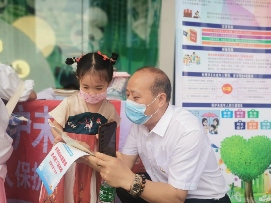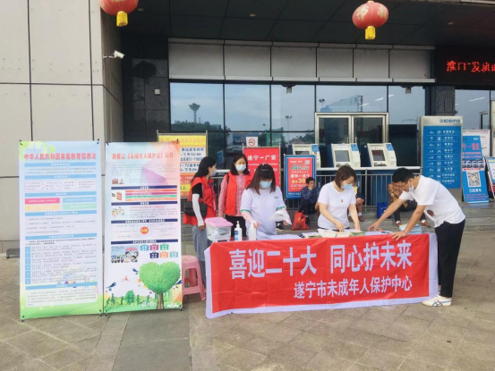 活动现场以“喜迎二十大,同心护未来”为主题,通过设置展板、悬挂横幅、发放手册等形式,向群众宣传《中华人民共和国未成年人保护法》和新颁布的《中华人民共和国家庭教育促进法》及未成年人关爱保护相关政策。