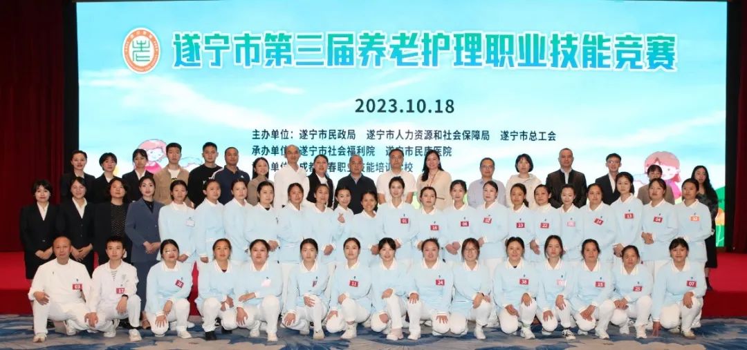 为深入学习贯彻习近平总书记关于养老服务工作重要指示批示精神,认真落实全国养老服务工作表彰暨养老服务人才队伍建设推进会议精神,提升全市养老服务专业水平,2023年10月17—18日,遂宁市第三届养老护理职业技能竞赛暨颁奖仪式在遂宁坦孚酒店隆重举行。比赛由市民政局、市人力资源社会保障局、市总工会联合主办,市社会福利院、市民康医院承办,成都成春职业技能培训学校协办。