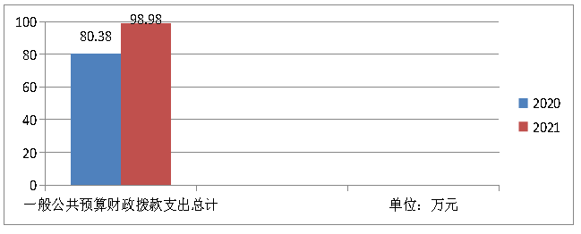 2021年一般公共预算财政拨款支出98.98万元,占本年支出合计的86.84%。与2020年相比,一般公共预算财政拨款支出增加18.6万元,增长23.14%。主要变动原因是基本工资上涨,保险基数调整,保险类支出增加。