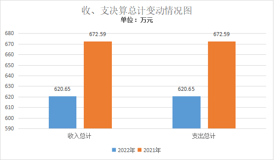 2022年度收、支总计620.65万元。与2021年相比,收、支总计各减少51.94万元,减少7.72%。主要变动原因一是2022对儿童福利院外墙立面进行了改造,费用86.15万元,二是2021年度收支总计中含上年结转资金年127.35万元。