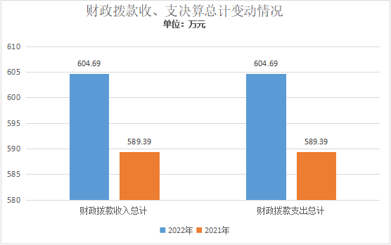 2022年财政拨款收、支总计604.69万元。与2021年相比,财政拨款收、支总计各增加15.30万元,增长2.60%。主要变动原因一是2022对儿童福利院外墙立面进行了改造,费用86.15万元,二是2021年度收支总计中含上年结转资金年85.46万元。