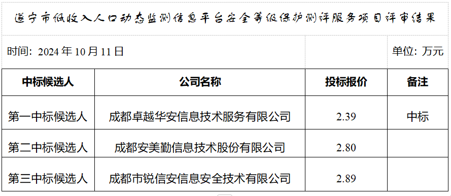 本着公平公正公开的原则,遂宁市民政局组评标委员会对遂宁市低收入人口动态监测信息平台安全等级保护测评服务项目进行了评审,现将评审结果公示如下。公示期为2024年10月14日至10月16日,共3个工作日。