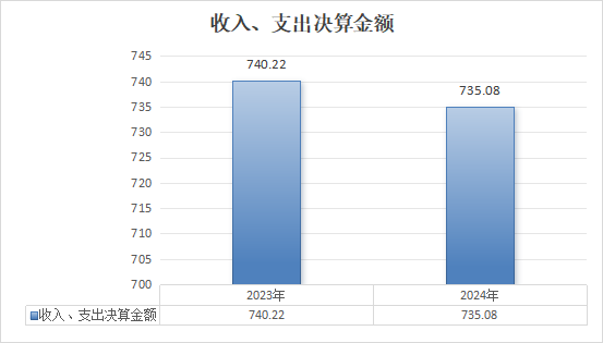 2024年度收入、支出总计均为735.08万元。与2023年度相比,收入、支出总计各减少5.14万元,下降0.7%。主要变动原因是人员调出,使得对应的经费减少。